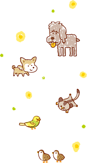 犬2匹、フクロモモンガ、セキセイインコ、ヒメウズラ2羽